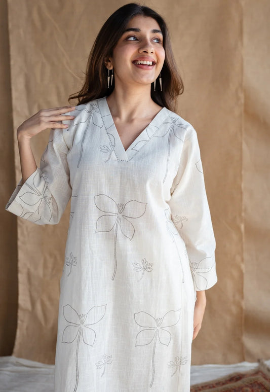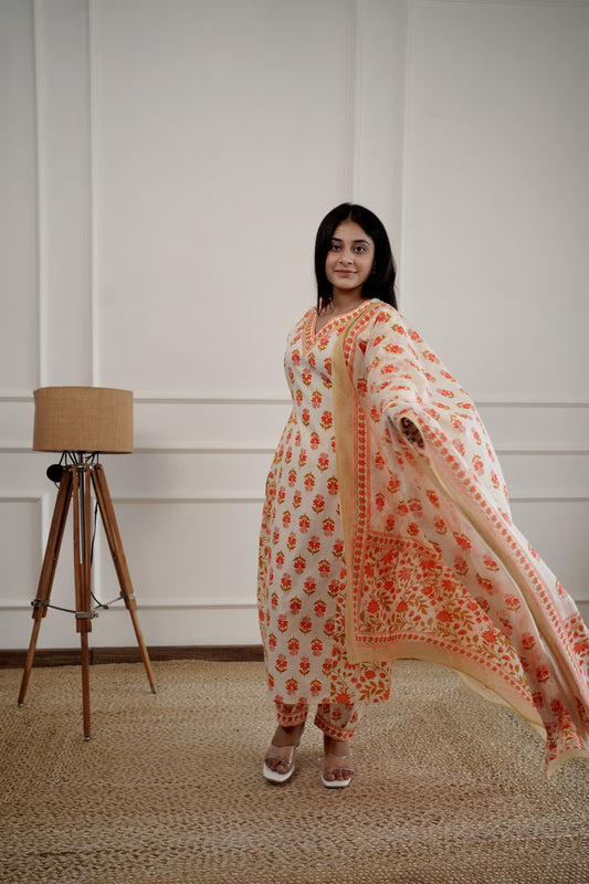 Off White Orange Cotton Kurta and Pant with Dupatta