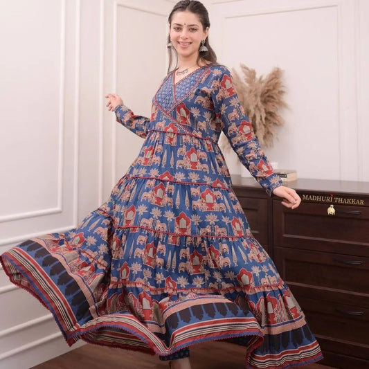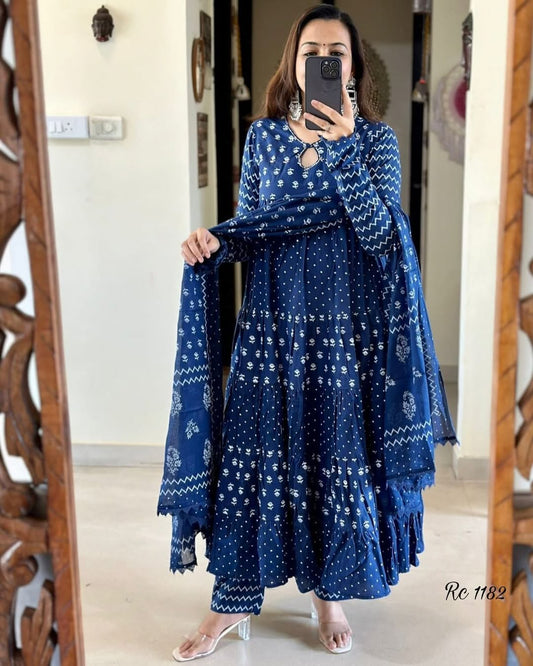 Pure Cotton Anarkali Kurta Pant And Dupatta Set Blue