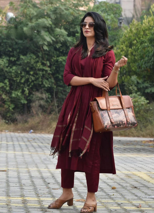 Premium Cotton Maroon Kurta Pant With Dupatta Set