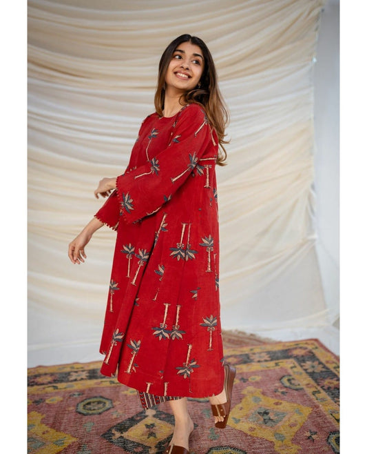 Pure Cotton Anarkali Kurta Pant And Dupatta Set Red